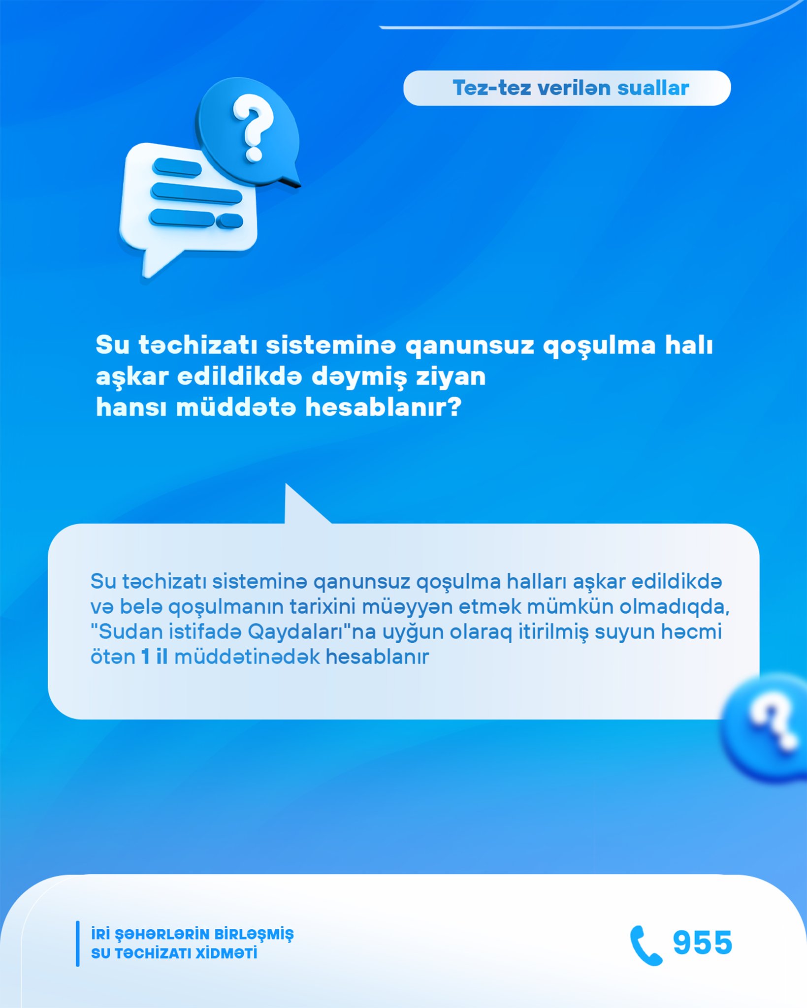 ✅ Su təchizatı sisteminə qanunsuz (özbaşına) qoşulma halları aşkar edildikdə qoşulmanın tarixini müəyyən etmək mümkün olmadıqda, itirilmiş suyun həcmi Sudan İstifadə Qaydalarına uyğun olaraq 1 il müddətində hesablanır.